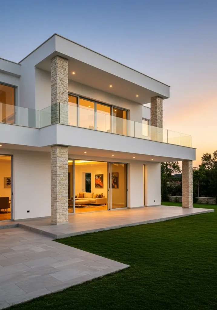This stunning home design exudes modern elegance with its sharp, clean lines and the perfect blend of glass and stone. The spacious exterior showcases large windows that invite ample natural light, providing a warm and inviting atmosphere inside. The use of neutral materials like stone and sleek glass railings highlights a contemporary aesthetic, while the well-manicured lawn and simple landscaping add a touch of nature, creating balance between the architecture and the surrounding environment.