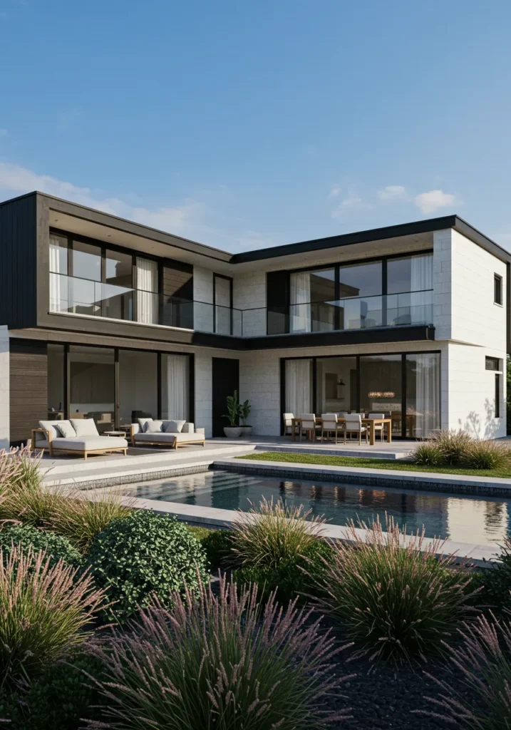 This sleek, modern home design captures the essence of minimalist luxury. The smooth, clean lines of the structure are complemented by large glass windows that seamlessly connect the interior with the outdoors. The outdoor area is just as impressive, with a sparkling pool reflecting the surrounding landscaping and giving the home a resort-like feel. The simple yet carefully selected greenery and low-maintenance landscaping add depth to the design without overwhelming the space.