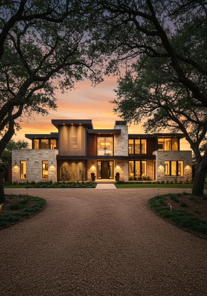 This modern luxury home features a beautiful balance of natural materials and sleek lines, nestled among lush trees. The exterior is a stunning mix of stone and wood, with large windows allowing the interior to seamlessly connect with the outdoors. The dramatic lighting in the evening casts a soft glow, highlighting the architectural features and creating a warm, welcoming atmosphere. The expansive gravel driveway leads to the entrance, further enhancing the grandeur of the home while keeping a rustic charm.