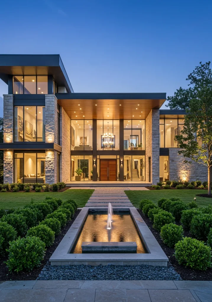 This luxurious home design features bold, contemporary architecture with large, floor-to-ceiling windows and a striking stone façade. The sleek lines and geometric shapes create a modern, yet timeless look. A beautiful water feature runs through the front yard, adding a tranquil element that reflects the grandeur of the home. The surrounding greenery, along with carefully placed lighting, enhances the beauty of the space, giving it a serene, almost resort-like atmosphere.