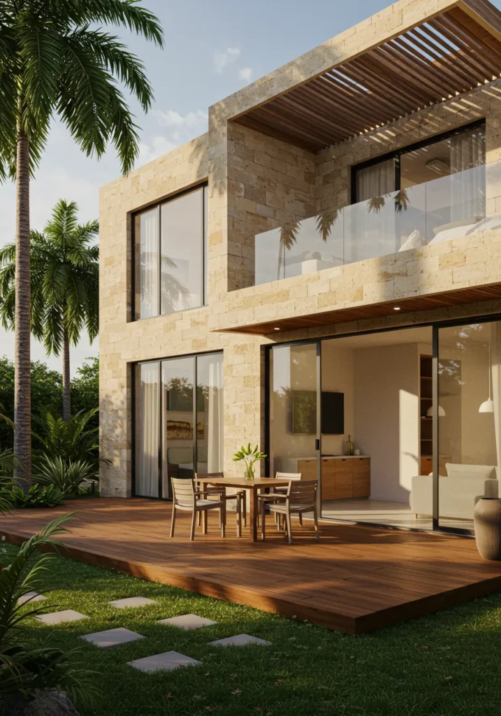 This modern home design combines the elegance of natural stone with the warmth of wooden elements, creating a perfect blend of rustic charm and sleek, contemporary style. The spacious outdoor deck extends seamlessly from the home, offering a relaxed space for dining or lounging with views of the surrounding greenery. Large glass windows open the interior to the outdoors, while the overhanging wooden roof creates a cozy yet stylish vibe.
