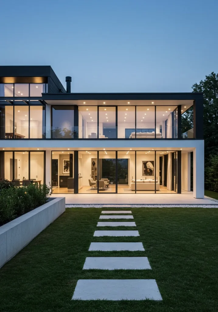 This luxurious home showcases a perfect blend of modern materials, with sleek glass panels and smooth concrete surfaces. The expansive windows provide unobstructed views of the outdoors, making the most of natural light and creating a sense of openness. The minimalist design is enhanced by the simple, geometric lines, while the stone pathway leading up to the house adds a touch of elegance. The contrast between the white exterior and dark frames gives the home a chic, contemporary look.