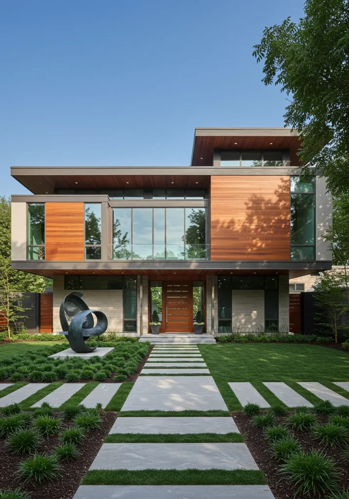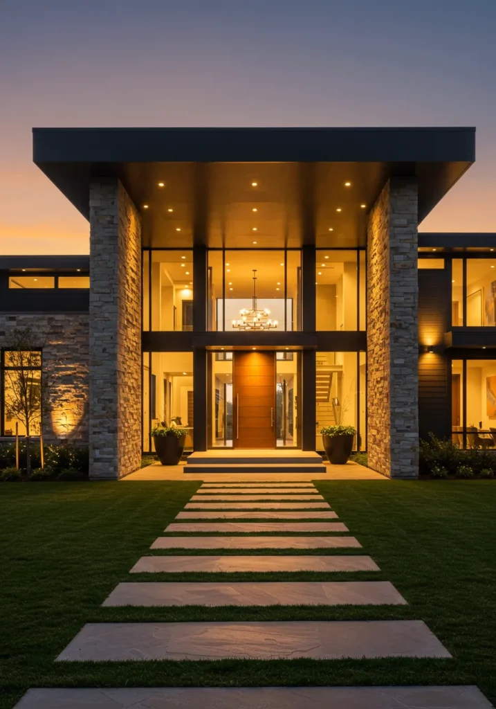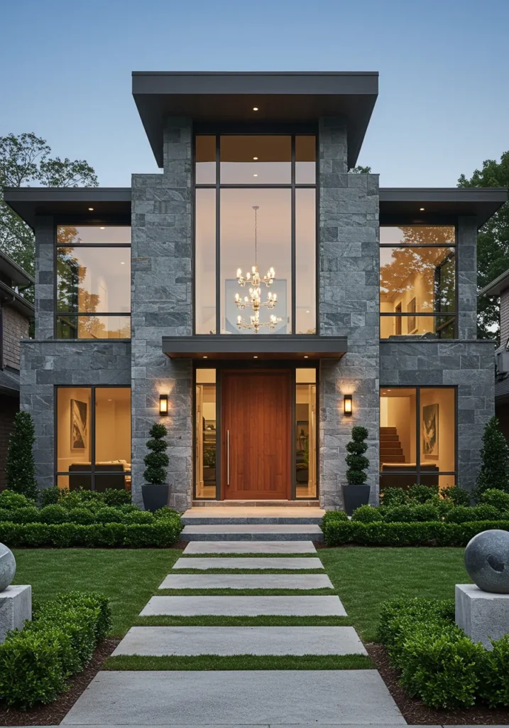 This stunning modern home combines sophisticated stonework with warm wood accents, creating a perfect balance between natural materials and sleek contemporary design. The exterior features expansive windows that invite natural light, while the front entrance is framed by elegant stone columns and a simple, yet striking, wooden door. The neatly manicured front lawn and clean pathway lead you straight to the inviting entrance, making the whole space feel polished and welcoming.