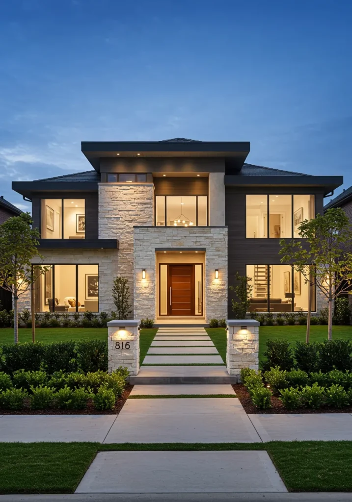 What I absolutely love about this design is how it blends contemporary elements with natural warmth. The mix of stone and wood gives it a grounded feel, while the sleek lines and bold structure make it stand out in the most stylish way. It’s the kind of home that feels both luxurious and welcoming at the same time. Every little detail, from the lighting to the landscaping, makes it feel like the perfect balance between modern and cozy.