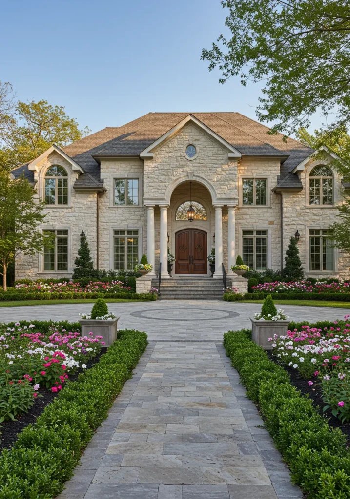 This grand stone mansion is the epitome of classic elegance. The symmetrical façade, complemented by soaring columns, gives it a stately, regal presence. Expansive windows allow for plenty of natural light, while the rich details in the stonework add texture and depth. The beautifully landscaped front yard with vibrant flowers and neatly manicured hedges leads up to a grand set of wooden double doors, making this home feel welcoming yet luxurious.