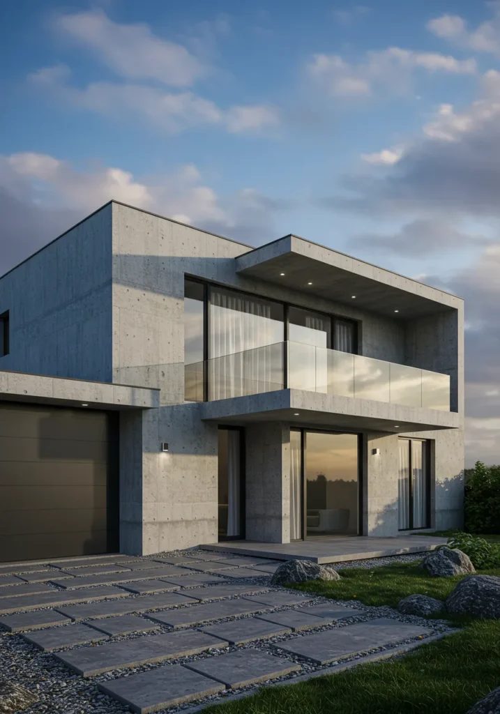 This stunning minimalist concrete home features sleek, geometric lines and an open, airy design. The large glass windows create a seamless connection between the interior and the surrounding nature, offering breathtaking views. The balcony, which juts out from the main structure, adds an element of drama, while the carefully placed stone pathway and rocks in the front yard bring a touch of natural beauty to the otherwise clean and contemporary design.