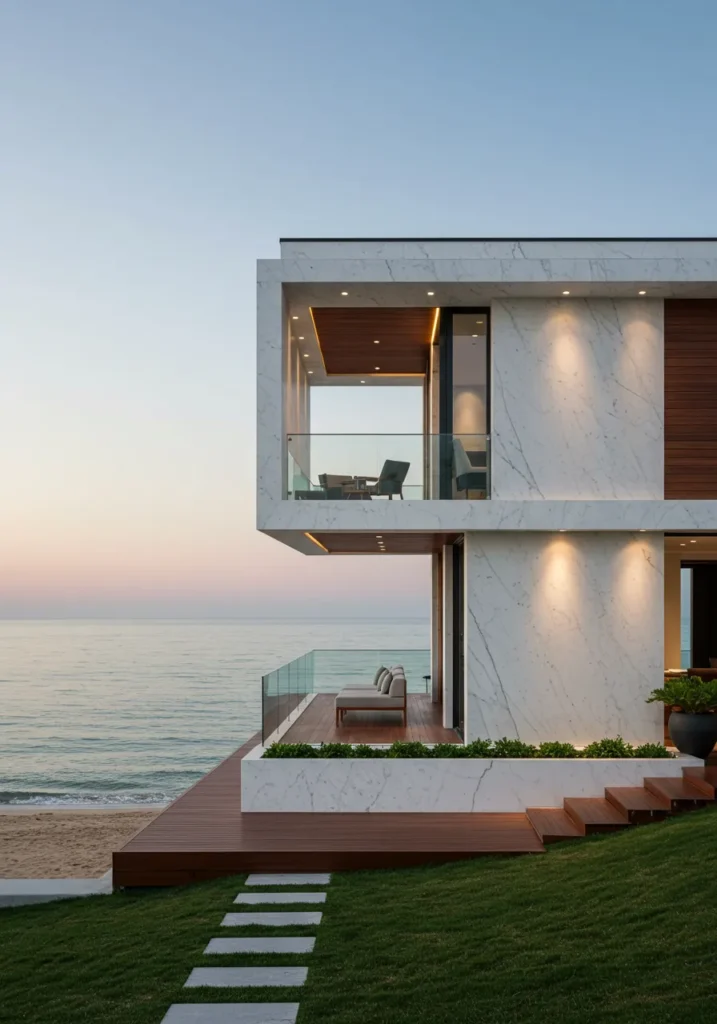 This luxurious home design perfectly combines sleek modern architecture with the natural beauty of its beachfront setting. The white marble façade stands out against the tranquil blue of the ocean, while the wooden accents and outdoor decking add warmth and contrast. The spacious balcony offers an unobstructed view of the beach, creating the ultimate serene retreat. Large windows let in ample natural light, and the minimalist design keeps the focus on the breathtaking surroundings.