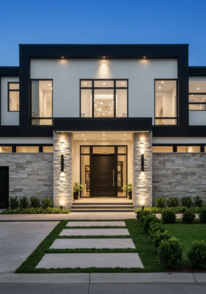 This luxurious home showcases a stunning blend of modern stonework and large glass windows. The clean lines and minimalistic design are framed by stone columns and sleek black finishes. The expansive front entrance is both inviting and impressive, with a well-lit pathway leading up to the large, bold front door. The use of large glass panels throughout the home allows for a seamless transition between the indoor and outdoor spaces, creating an airy and spacious feel.
