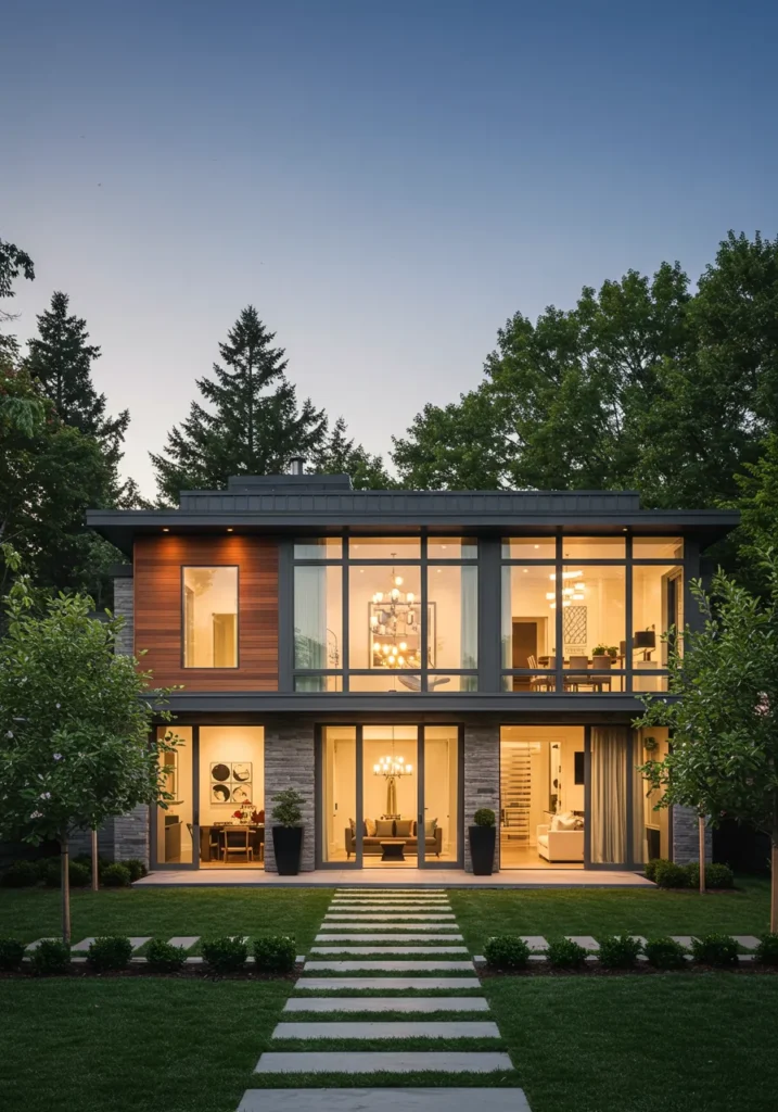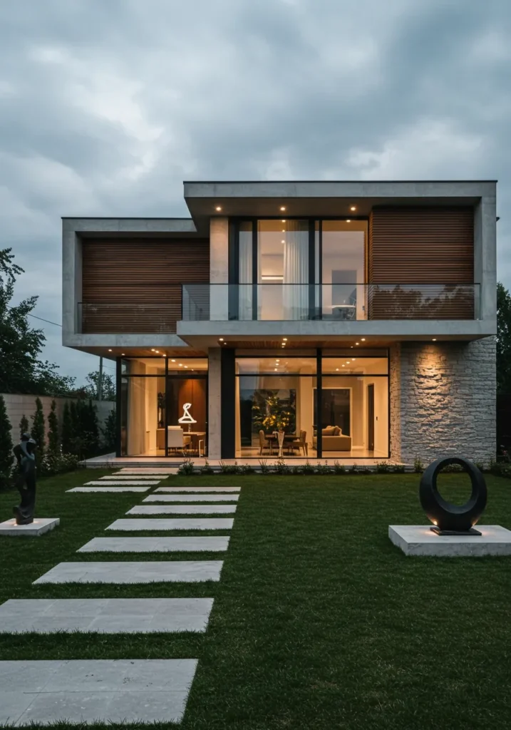 I absolutely adore how this design manages to feel both refined and comfortable. The combination of stone and wood creates such a warm, inviting vibe while maintaining a strong, modern aesthetic. The large windows open up the home to the outdoors, making it feel airy and bright, while the well-maintained lawn and minimalist design add to its overall elegance. It’s a perfect home that strikes a beautiful balance between modern sophistication and natural warmth. I can totally imagine myself enjoying cozy moments inside with this beautiful exterior as a backdrop!