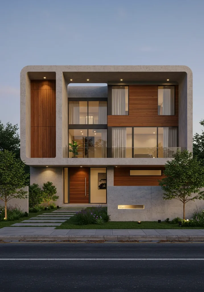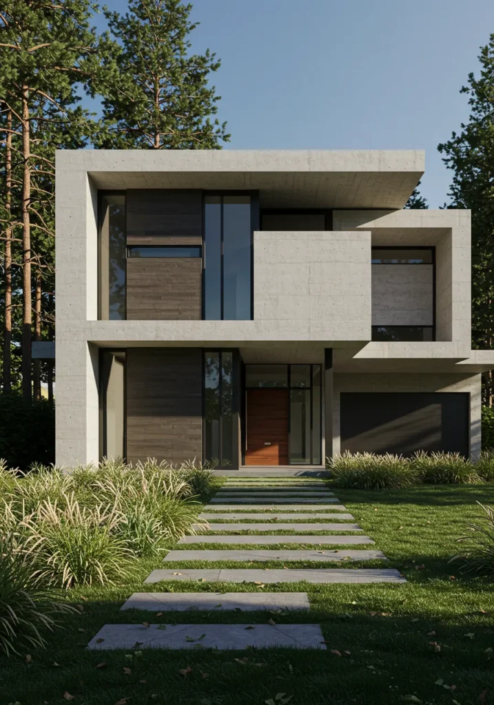 This striking house design beautifully blends the raw texture of concrete with the warm elegance of wood accents. The clean, sharp lines of the structure are softened by the natural elements, creating a striking balance between modernity and nature. Large floor-to-ceiling windows allow an abundance of natural light to flood the interior while offering unobstructed views of the surrounding landscape. The sleek, minimalistic façade is enhanced by carefully placed greenery and simple stone walkways that lead up to the inviting front door.