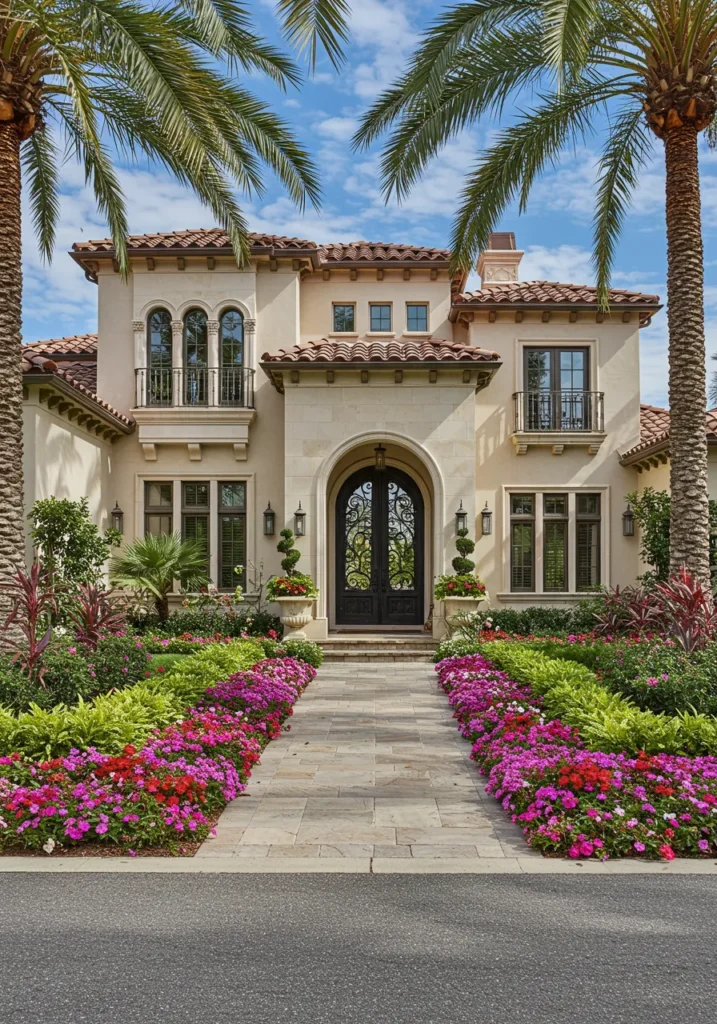 This Mediterranean-inspired villa exudes warmth and charm with its stone façade and red-tiled roof. The arched windows and grand entryway add to the inviting appeal, while the perfectly manicured landscaping, with lush greenery and vibrant flowers, creates a welcoming atmosphere. Tall palm trees flank the entrance, adding to the exotic flair. The attention to detail is evident, from the classic wrought-iron balcony railings to the intricate stonework around the windows.