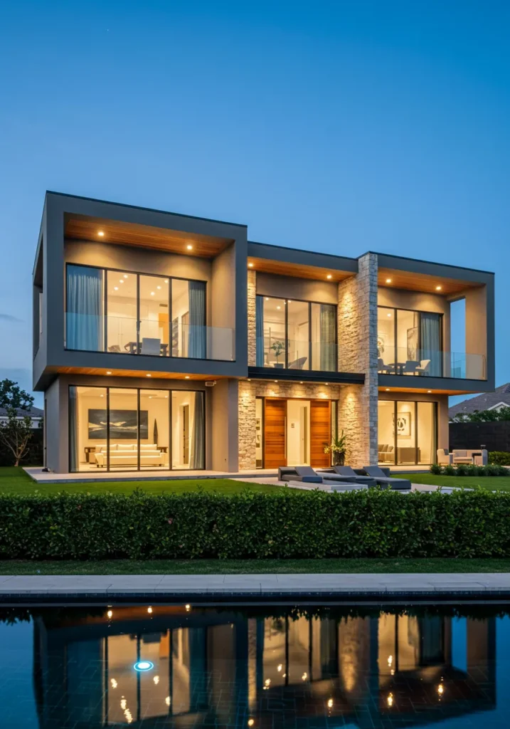 What I absolutely adore about this design is how effortlessly it combines sharp, modern elements with natural materials. The stonework gives the home a grounded, timeless quality, while the glass and steel create a fresh and contemporary vibe. The warm lighting at night adds a welcoming touch, turning the home into an inviting beacon. It’s the perfect mix of elegance and modern luxury, and I’m just obsessed with how striking and beautiful it looks from every angle.