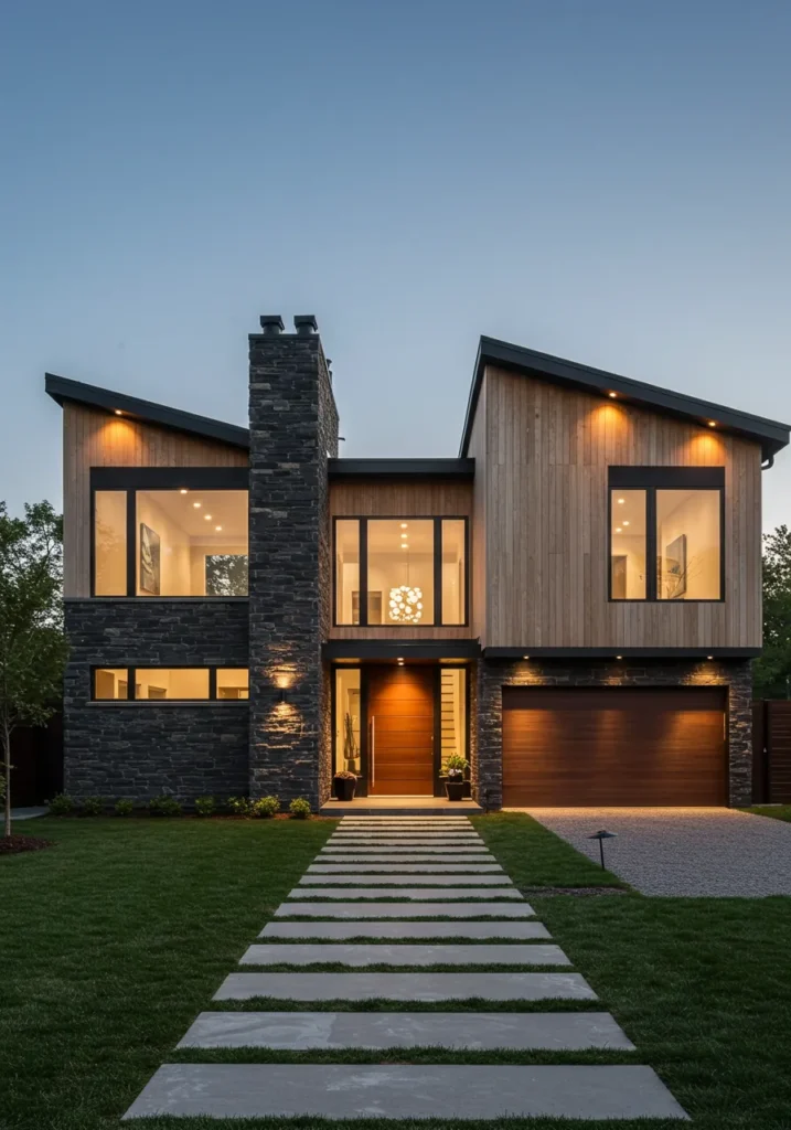 This stunning modern home design stands out with its beautiful combination of natural stone and warm wood panels. The sharp angles of the roof create a dynamic and bold silhouette, while large windows allow natural light to flood the open interior. The stone chimney adds a rustic touch, perfectly complementing the sleek design. The well-maintained front yard, with clean stone pathways, creates an inviting atmosphere leading up to the entrance.