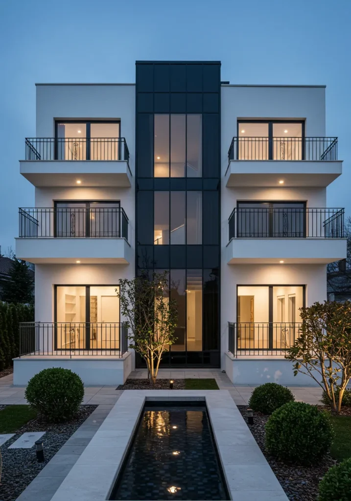 This stunning home stands out with its sleek, contemporary lines and stylish use of glass and stone. The striking glass center creates a focal point, while the white exterior and dark accents offer a clean and polished look. The strategically placed balconies add elegance, and the soothing water feature in front of the home further enhances the serene atmosphere. The surrounding landscaping is minimal yet sophisticated, with neatly trimmed greenery adding a touch of life to the design.