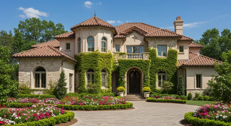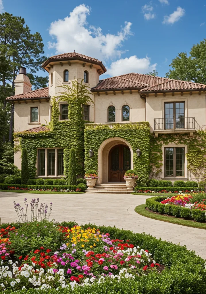 This beautiful home design brings a touch of Italy to its surroundings, with charming Mediterranean-inspired features like terracotta roof tiles and a graceful stone façade. The ivy-covered exterior adds an inviting, almost whimsical feel to the structure, while the circular archways and large windows highlight the home’s classic design. The vibrant garden in front, bursting with colorful flowers, offers a lovely contrast to the neutral tones of the house, making it feel warm and welcoming.