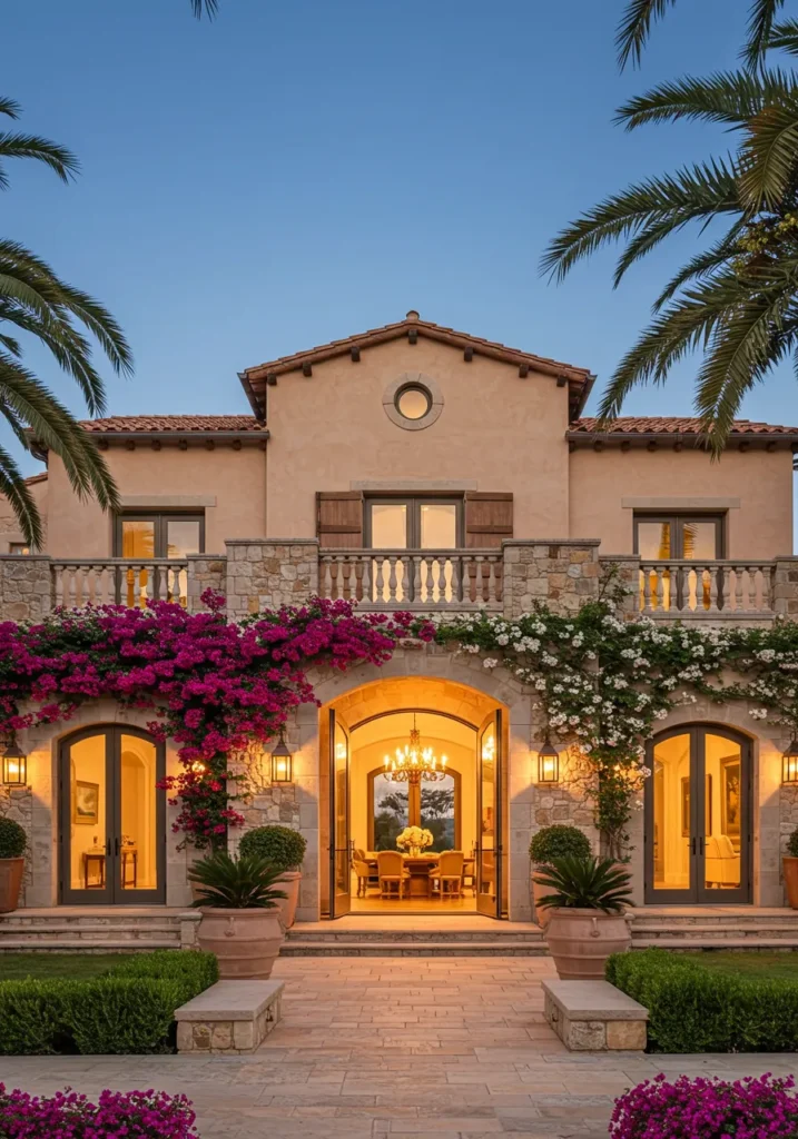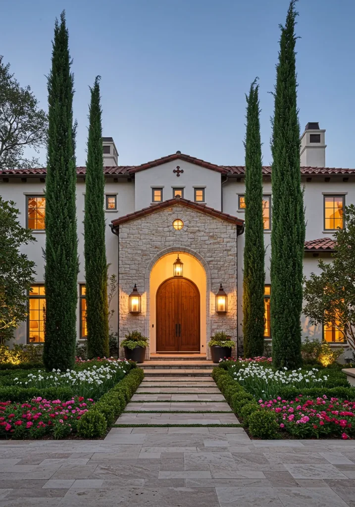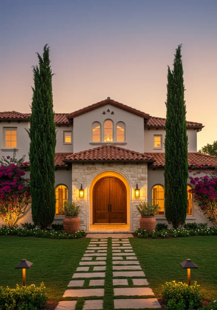 This Mediterranean-inspired home is a perfect blend of luxury and charm. With its warm stone accents framing the beautiful arched doorway, the house feels inviting yet grand. The tall, slender cypress trees add height and symmetry to the front, while lush, blooming bougainvillea surrounds the entryway in a burst of color. The path leading to the front door is lined with smooth stone steps, guiding visitors to the stunning wooden doors, and the soft, warm lighting enhances the peaceful evening atmosphere.
