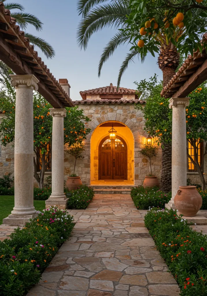 This Mediterranean villa welcomes you with its charming courtyard entrance, framed by tall, elegant columns and beautiful orange trees. The pathway, made of large stone tiles, leads you up to an inviting wooden door, with a warm, golden glow shining from the windows. The combination of natural stone, rustic wooden accents, and lush greenery gives this home a timeless Mediterranean feel, while the carefully placed lighting adds a soft, welcoming ambiance to the exterior.