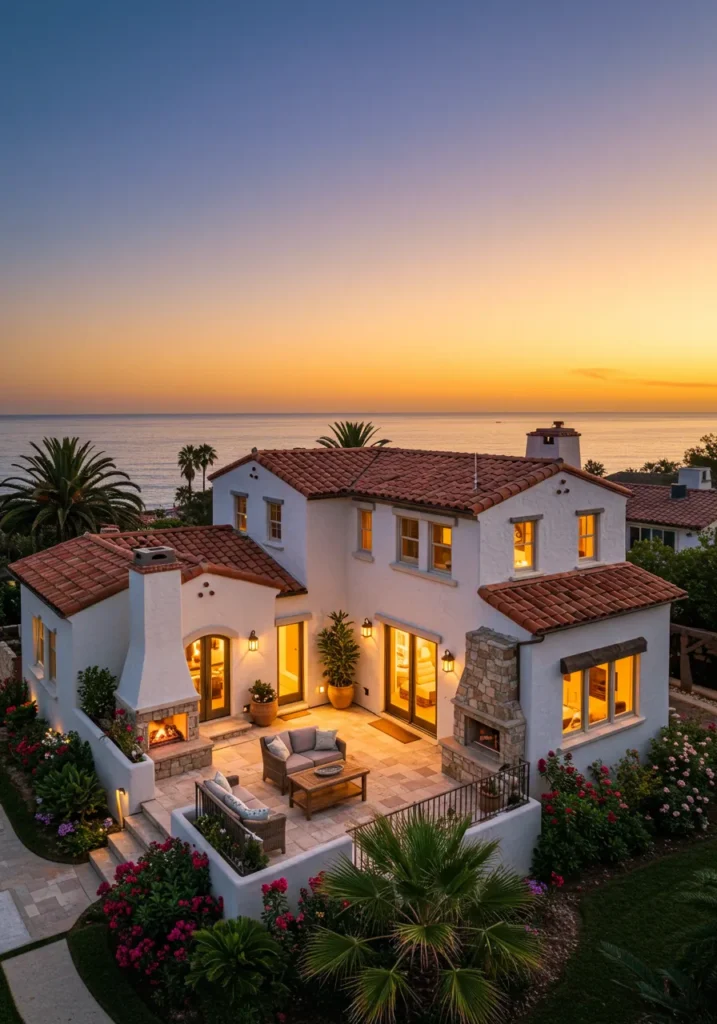 This Mediterranean villa captures the essence of coastal luxury with its inviting outdoor patio area, complete with a cozy seating arrangement around a stone fireplace. The soft, earthy tones of the stucco walls, paired with the terracotta roof, give the house a timeless and welcoming appeal. The lush, colorful landscaping, paired with the beautiful sunset views over the ocean, creates a peaceful and luxurious atmosphere. The well-placed lighting enhances the beauty of the home as evening falls, making it the perfect retreat for enjoying warm nights.