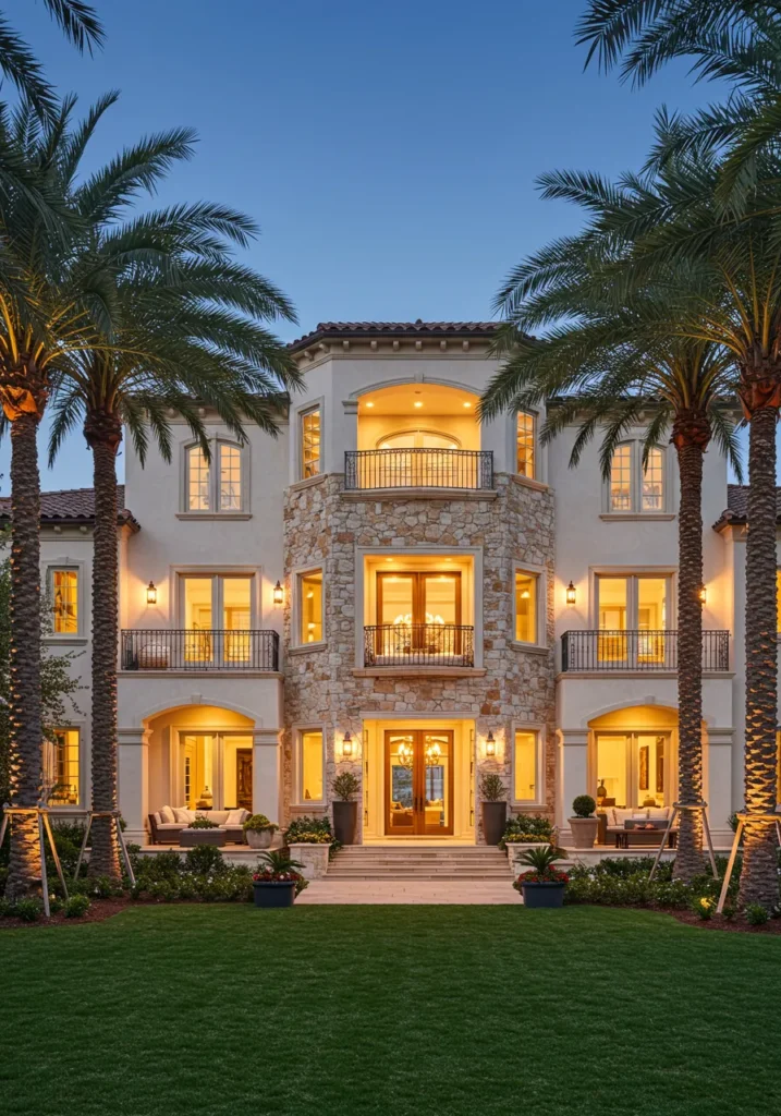 I absolutely adore how the combination of the stone details and the modern touches gives this house a timeless elegance. The palm trees surrounding the property really emphasize the Mediterranean vibe, giving it that vacation feel, right at home. The grand entrance and beautifully lit exteriors really make a statement at night, and I can’t help but imagine how magical it would be to host friends in the evening with the warm glow lighting up the space. If I could, I’d spend hours lounging in that front area, soaking in the beauty of it all. Just looking at this house makes me dream of summer nights!