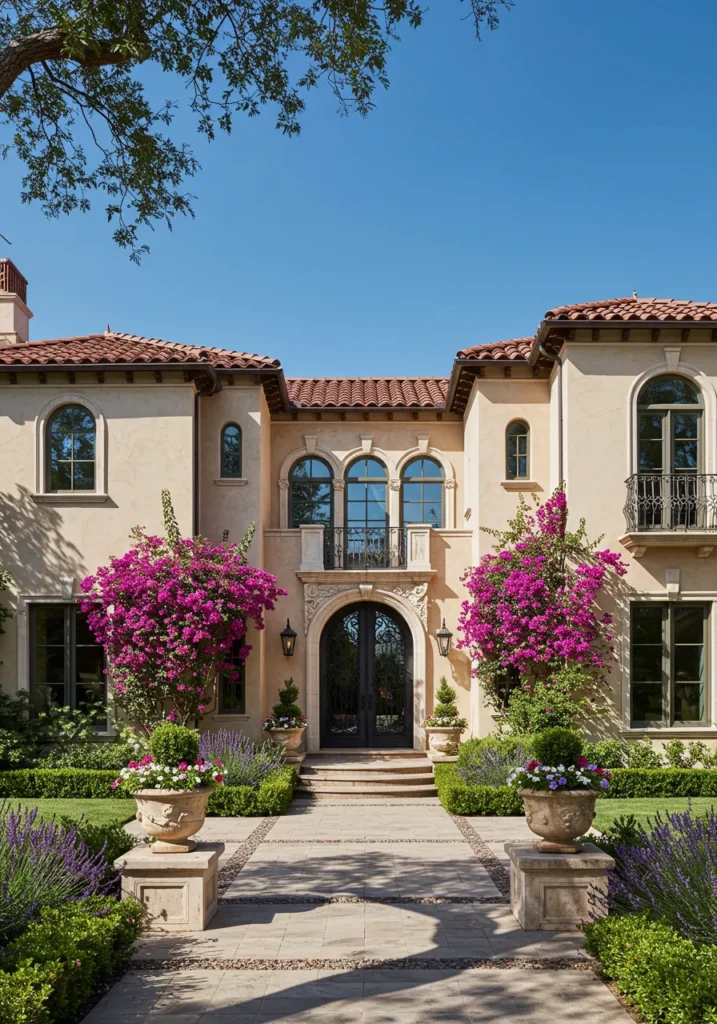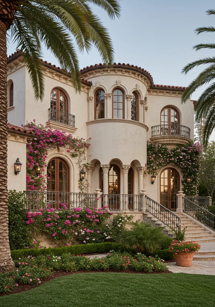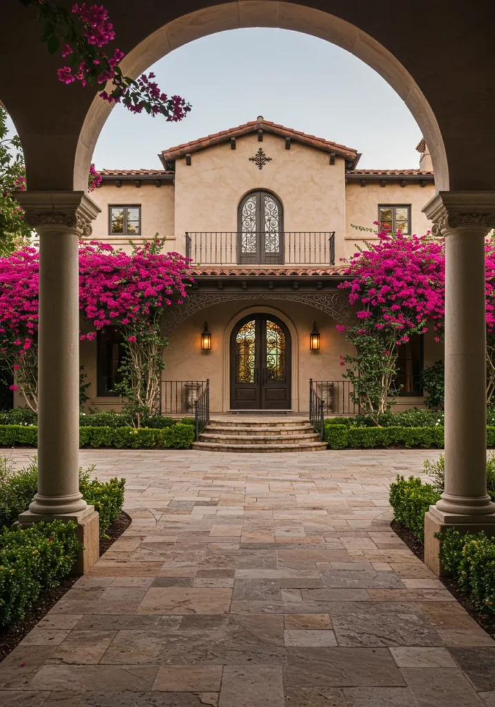 I can’t help but fall in love with the elegance of this design! The balance between the grand stonework and the lush greenery creates such an enchanting atmosphere. Those arched windows are just gorgeous, and the way the bougainvillea adds a pop of vibrant color makes the whole space feel so alive. It’s the kind of home that makes you feel like you’re stepping into a dream—a mix of romance and refined luxury. It’s absolutely perfect for anyone looking to create a warm, welcoming, and beautiful space that still feels grand and impressive.