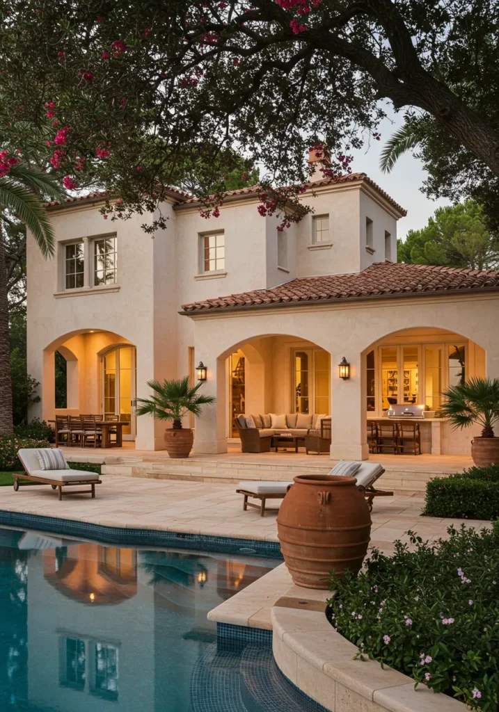 I can’t help but fall in love with this design! The balance of the earthy tones, the elegance of the arches, and the serene poolside vibe just speaks to me. It feels like the ultimate blend of cozy luxury and peaceful retreat. I can already imagine spending warm summer evenings here, sitting by the pool with friends and family. It’s a design that’s both inviting and impressive—elegant yet approachable. How gorgeous would it be to entertain or simply relax in this dream home?