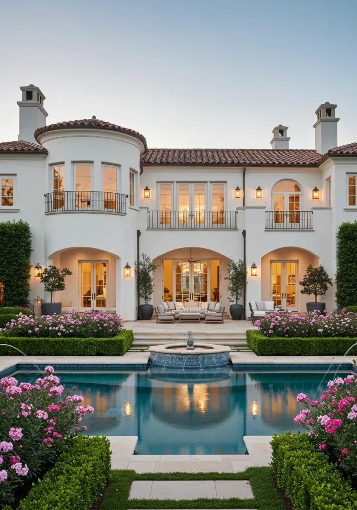 This Mediterranean villa exudes elegance with its charming white facade, accented by rounded windows and dark shutters. The design is effortlessly complemented by a graceful archway leading to a grand entrance. At the forefront of the home, a sparkling pool mirrors the beauty of the lush landscaping surrounding it. Vibrant pink and white flowers frame the pool, giving the space an inviting, colorful atmosphere. Tall trees and manicured shrubs create a peaceful garden setting, while the charming seating area near the pool invites relaxation and outdoor entertaining.