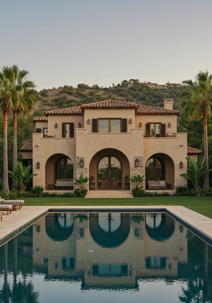 This Mediterranean beauty features soft, earthy tones with a smooth stucco finish and a rustic tiled roof that perfectly reflects the timeless elegance of Mediterranean architecture. The rounded arches framing the windows and doors create an inviting, open atmosphere, while stone accents on the exterior give it a touch of natural charm. The home is perfectly paired with a glistening pool that mirrors the striking design of the house, creating an almost magical reflection. Tall palms and lush landscaping surround the space, enhancing the home’s connection with nature.