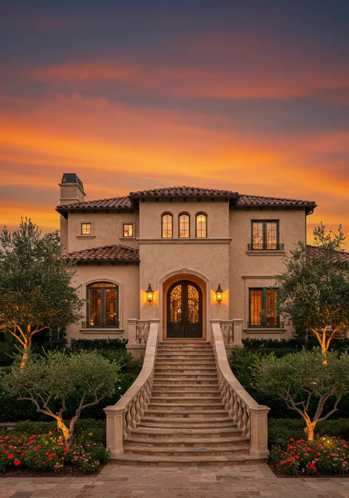 This Mediterranean-style home features a striking grand staircase that draws the eye to the gorgeous arched front door, flanked by vintage-inspired light fixtures. The warm, earthy tones of the stucco walls and the tiled roof create an inviting yet majestic feel. The lush greenery and flowering plants that line the walkway add a touch of vibrancy, while the tall, elegant trees perfectly frame the entrance, emphasizing the grandeur of the architecture. The overall design balances sophistication and comfort, offering a sense of both luxury and coziness.