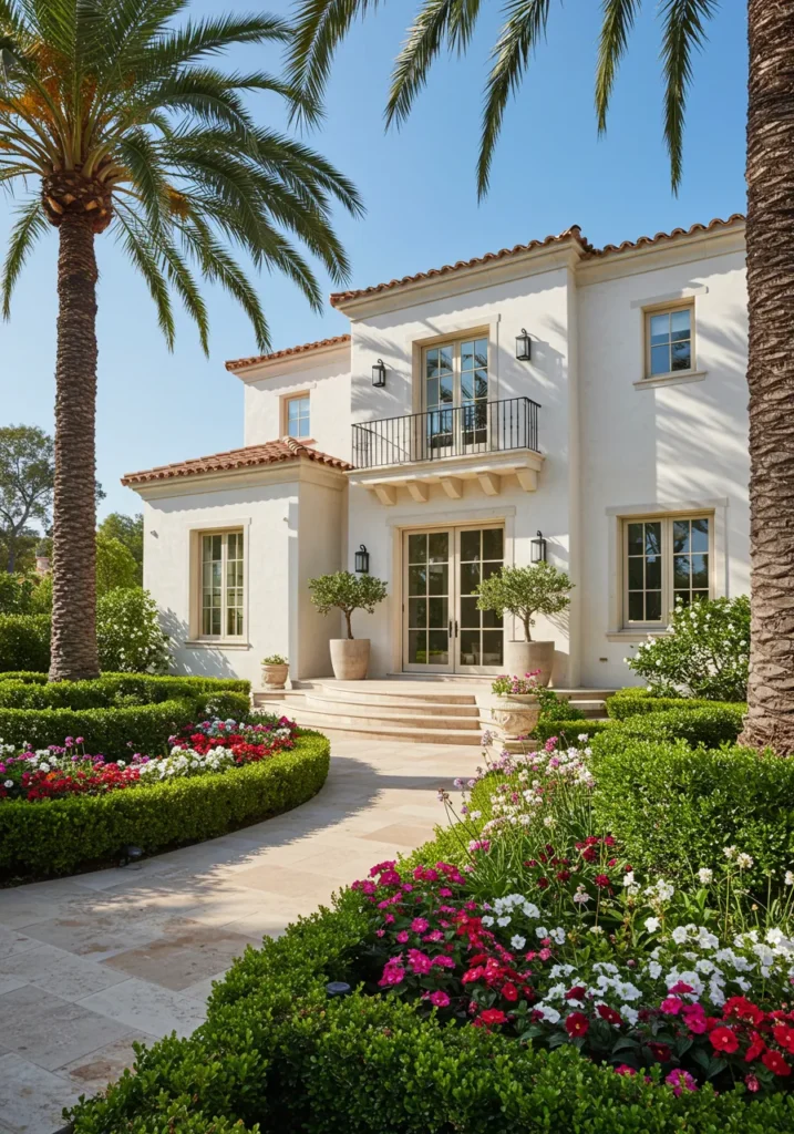 What I love most about this design is how everything feels so perfectly balanced—each detail is thoughtfully placed, from the orderly flower beds to the symmetrical layout of the windows and doors. The bright white exterior paired with the deep, earthy tones of the roof gives the house a warm, welcoming feeling, while the landscaping adds that extra pop of color and texture. It’s one of those designs that makes you want to relax with a glass of lemonade on the front porch and enjoy the beautiful surroundings. I can absolutely see myself living here and soaking up all the Mediterranean vibes!