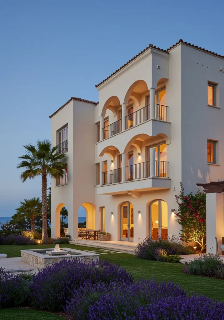 This Mediterranean luxury home stands tall with its clean white walls and sophisticated arches that immediately draw your attention. The home features multiple balconies that overlook the lush, manicured landscape, with elegant palm trees framing the view. A charming water fountain adds a serene touch to the outdoor space, while vibrant purple lavender provides a stunning contrast, filling the air with a fresh scent. The open outdoor living area seamlessly flows into the surrounding beauty, making it feel like a private oasis.