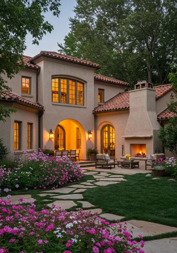 This charming Mediterranean-style home exudes warmth and elegance with its welcoming façade, terracotta roof, and soft stucco walls. The outdoor space is a highlight, featuring a cozy stone fireplace surrounded by lush greenery and vibrant flowers. A pathway of stepping stones leads to the inviting seating area, where you can imagine yourself relaxing by the fire on a cool evening. The combination of architectural arches, tall windows, and perfectly manicured landscaping creates a timeless look that feels both luxurious and comfortable.