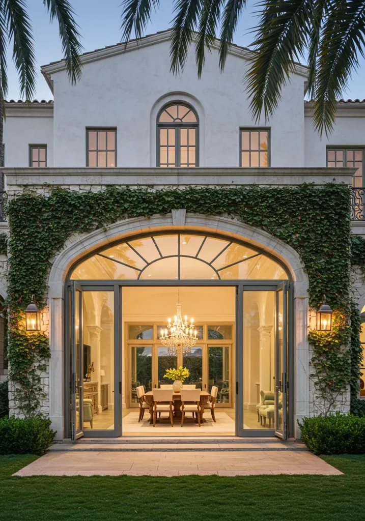 What I absolutely love about this design is how it balances elegance with a touch of natural beauty. The ivy climbing the sides of the house creates a gorgeous connection between the building and its surroundings, making it feel grounded in nature. The view through the grand arch is stunning, with the warm lighting inside offering a peek into a luxurious, cozy interior. It’s a perfect blend of sophistication and comfort, and I can’t help but imagine myself walking up that beautiful path and entering a home filled with charm. This is definitely the kind of house I would want to relax in while enjoying a glass of wine on a cool evening!