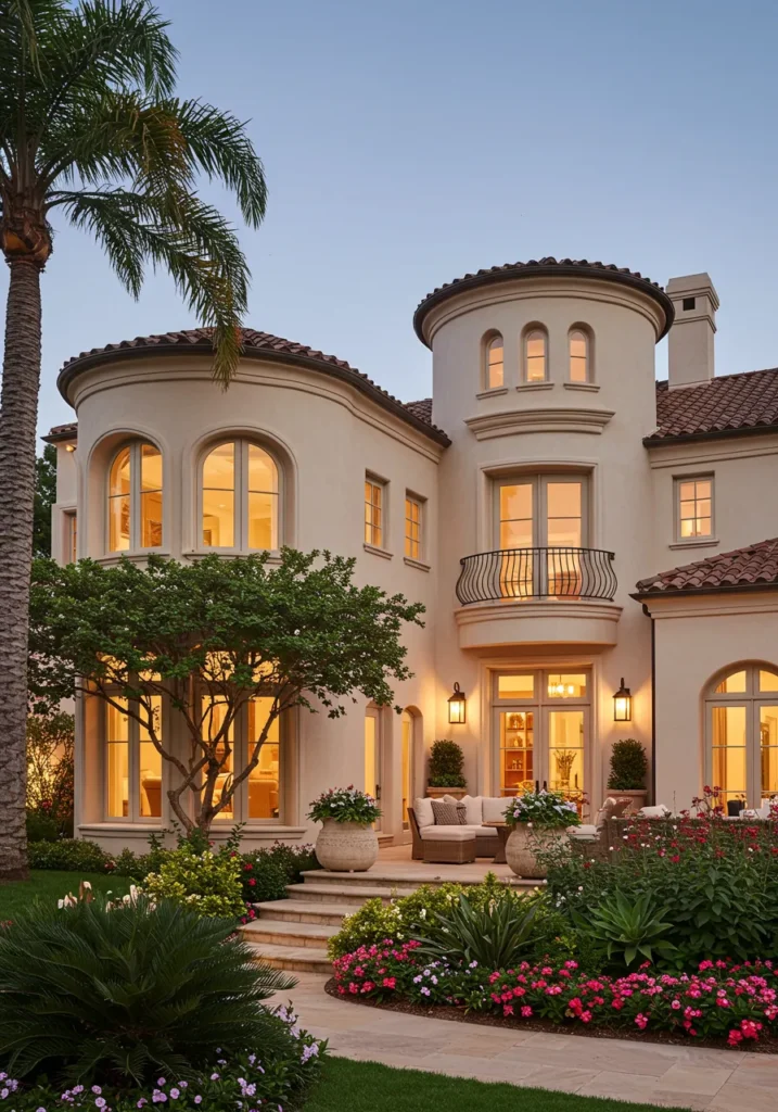 Mediterranean Charm with Curved Architecture and Vibrant Landscaping