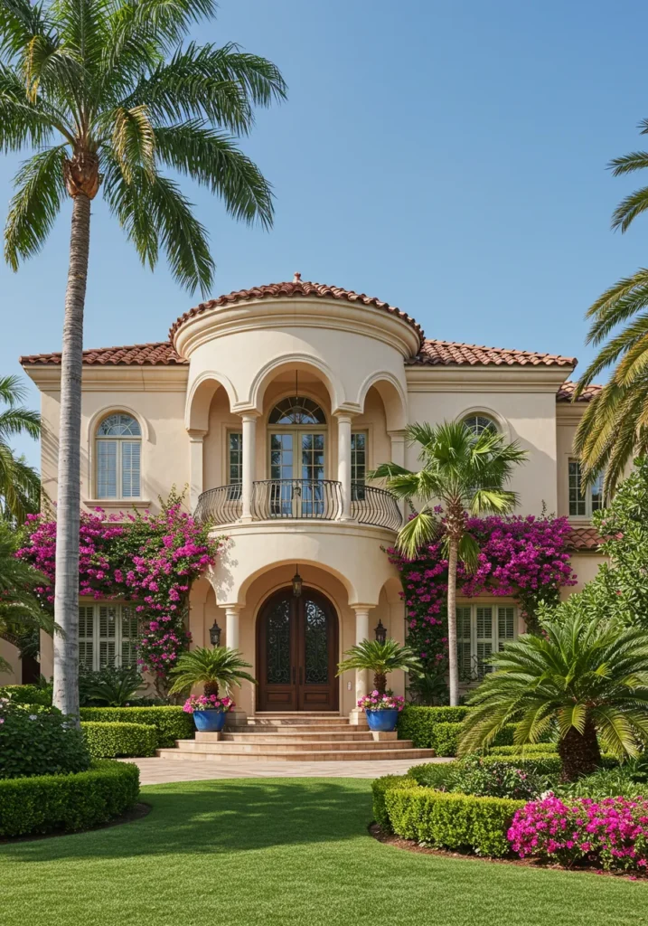 What really captures my attention with this design is how it seamlessly blends luxury with nature. The bougainvillea and palm trees instantly bring a touch of the exotic, while the structure itself feels both grand and inviting. I can almost imagine sipping my morning coffee on the front steps, surrounded by the colorful blooms and enjoying the peaceful ambiance. This home is a perfect mix of beauty and comfort, with all the charm that makes Mediterranean homes so special. It’s one of those places where every detail feels carefully thought out to bring warmth and serenity to your everyday life.