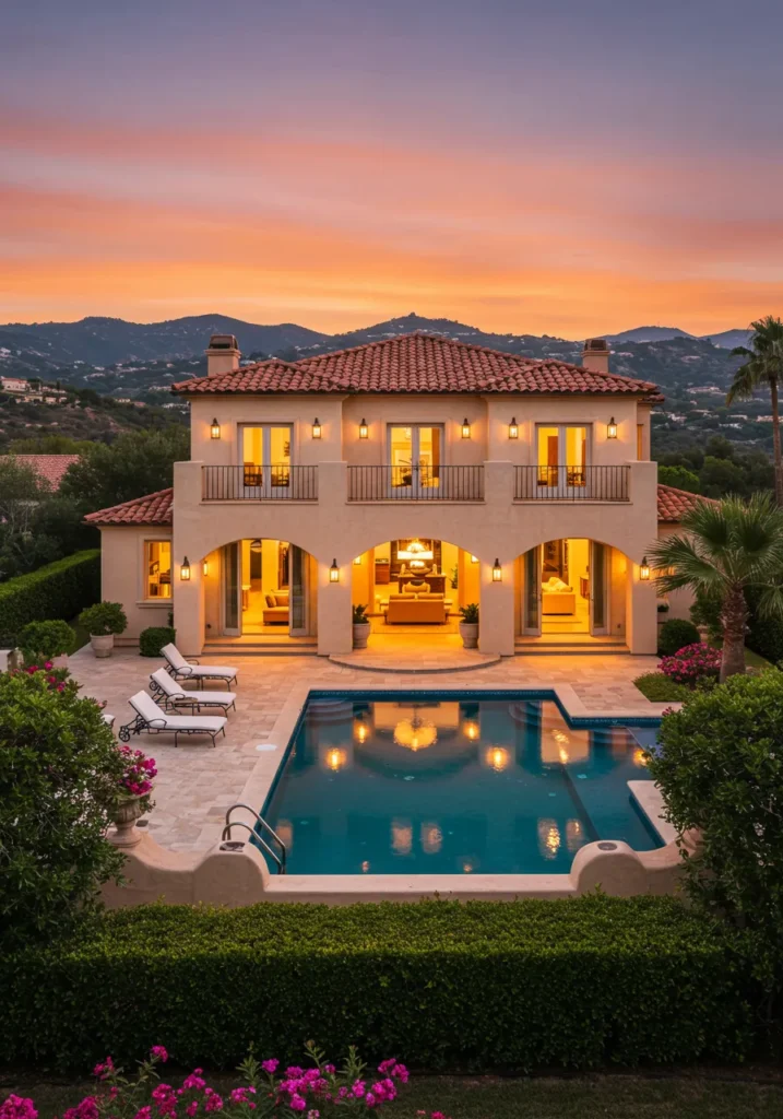 This Mediterranean luxury villa is a true showstopper, offering stunning views from every angle. The warm, terracotta-tiled roof and creamy stucco walls give it an undeniable charm, while the large, inviting windows let you peek into the cozy interiors. The home is centered around a beautiful pool area, with elegant loungers lining the edges and a perfectly manicured landscape framing the entire scene. As the sun sets behind the distant mountains, the lighting on the exterior walls creates a magical glow, highlighting the graceful arches and adding a welcoming touch to this luxurious home.