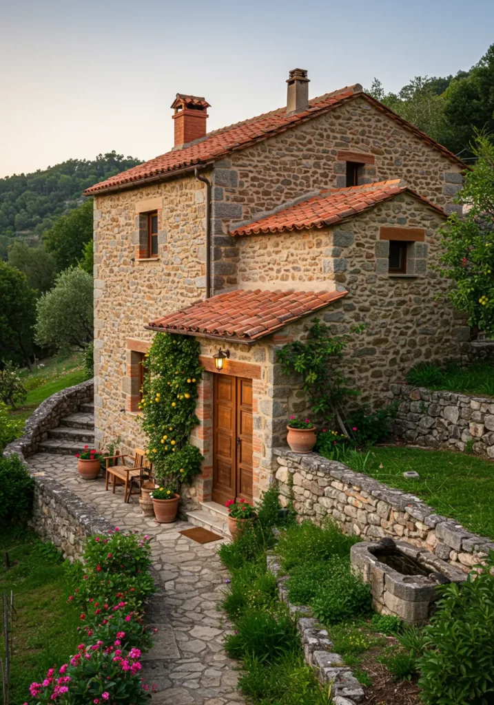 I absolutely adore how the design uses both classic Mediterranean elements and vibrant greenery to create a truly welcoming ambiance. The balance of earthy tones with bursts of floral color makes it feel warm and alive. Personally, I think this house would be the perfect setting for a relaxing evening, with the soft lighting casting a golden glow over the stunning stonework and flowers. It’s a design that effortlessly brings together elegance and comfort, which I find incredibly appealing.