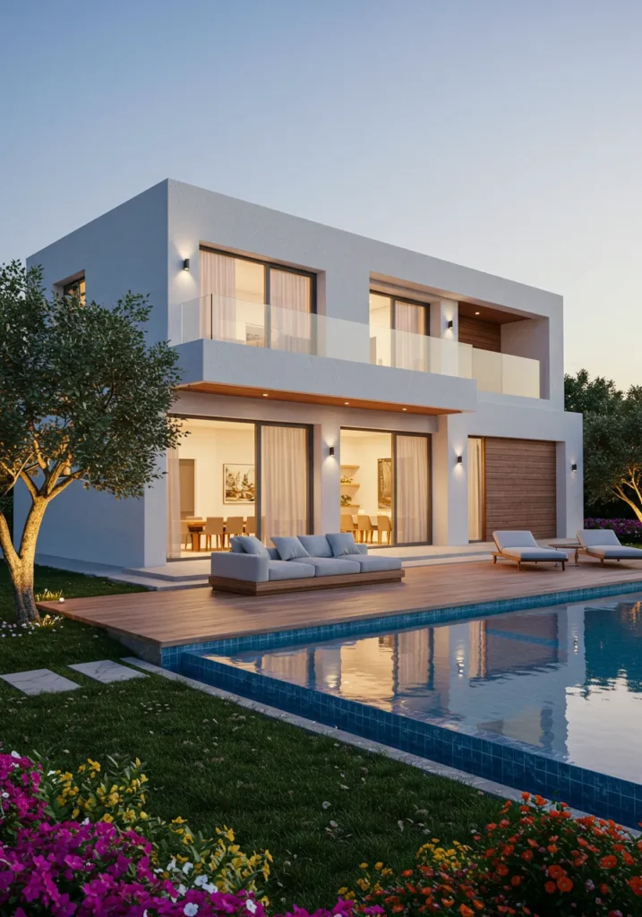 This sleek, contemporary Mediterranean villa is a perfect blend of modern luxury and classic Mediterranean charm. The crisp, white exterior gives off an air of freshness and lightness, while the large windows and sliding glass doors open up to a spacious wooden deck. The pool, reflecting the serene sky, invites you to relax and soak in the peaceful surroundings. The minimalist design, complemented by greenery and vibrant flowers, provides a perfect backdrop for those who appreciate both beauty and simplicity.