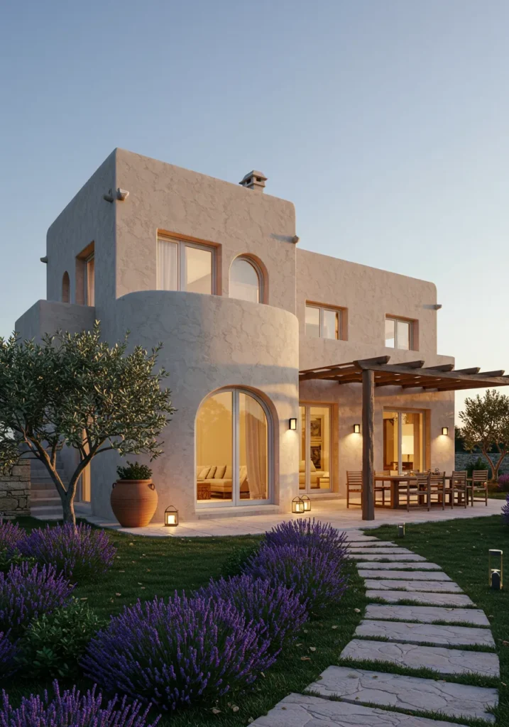 This Mediterranean home stands out with its clean, curved design and fresh white stucco exterior. The smooth, rounded arches of the windows create a soft, inviting atmosphere that contrasts beautifully with the sharp lines of the wooden pergola in the outdoor dining area. The spacious patio opens directly onto the manicured lawn, with lush purple lavender filling the space with color and fragrance. This home is a true balance of modern style and Mediterranean charm, blending both luxury and simplicity in one design.