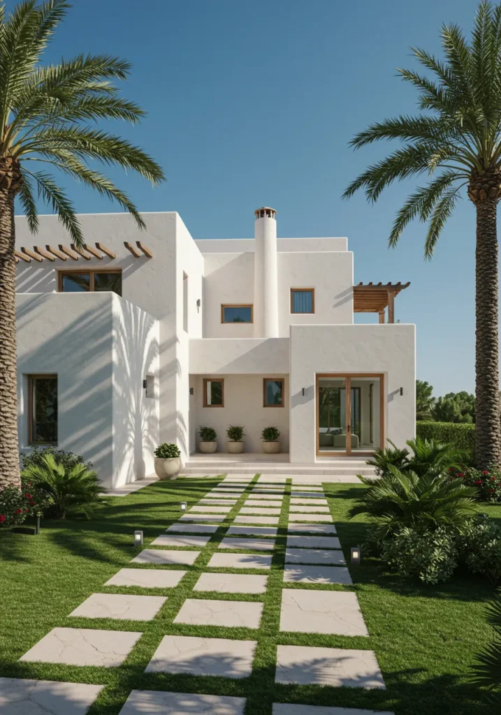 This Mediterranean villa has a strikingly modern design, combining sleek, straight lines with classic Mediterranean details. The crisp white stucco exterior pops against the vibrant greenery surrounding the house, while the wooden pergola and the simple, yet elegant, design elements make it feel welcoming and warm. Large windows allow natural light to flood the space, and the clean-cut stone pathway leading to the front door invites you in with charm and simplicity. The palm trees and lush plants surrounding the house add a soft, tropical feel that perfectly complements the minimalist design.