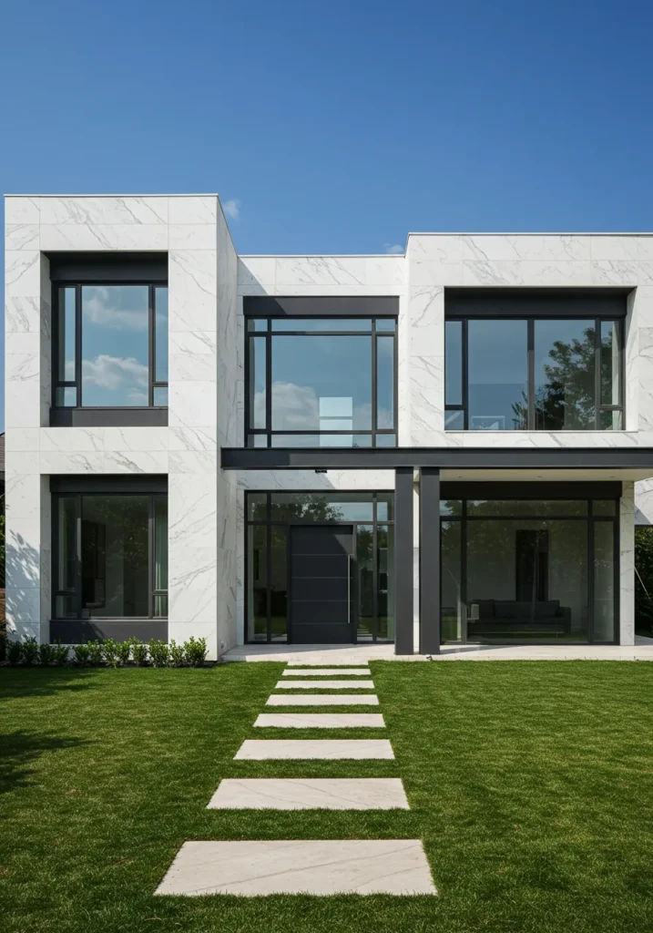 This modern home design showcases a striking marble facade paired with sleek black-framed windows, making it a perfect example of minimalistic elegance. The symmetrical layout highlights clean lines and geometric precision, while the soft greenery in the surrounding landscape offers a refreshing contrast to the bold, luxurious materials used in the exterior. The stone pathway guides you up to the front door, adding a touch of serene sophistication.