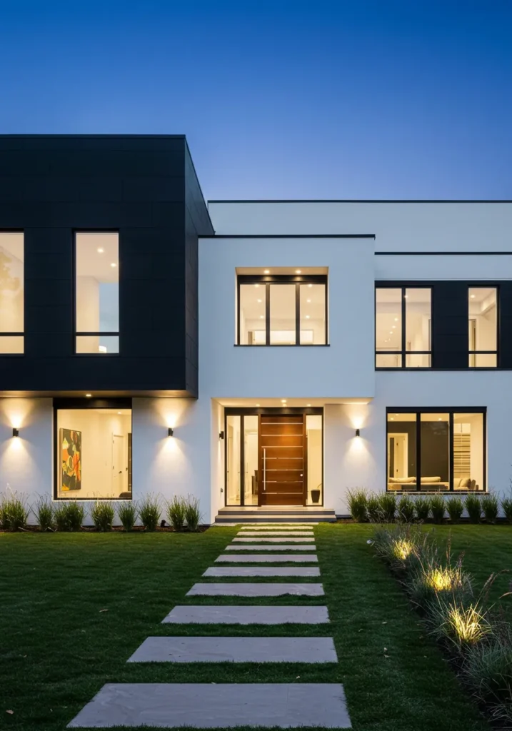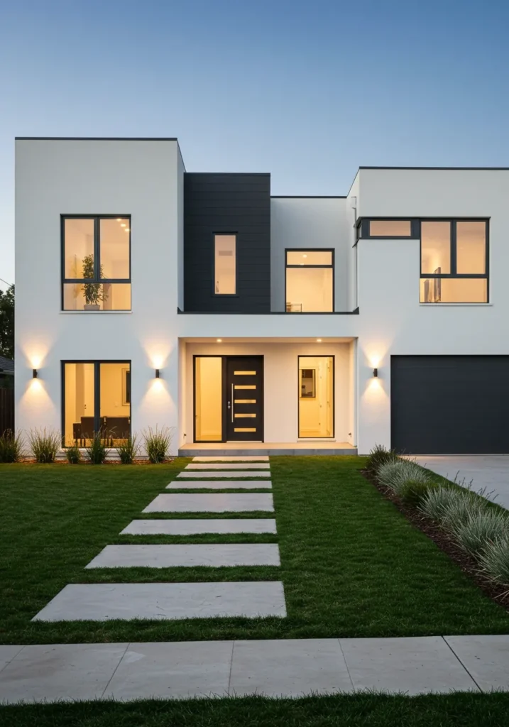 This stunning modern home combines sleek lines and bold contrasts to create a visually striking design. The clean white exterior is paired with dark accents, particularly around the windows and door frame, which gives the house a sophisticated and sharp look. The large windows allow for an abundance of natural light to flood the interiors, while the carefully landscaped yard with neatly arranged stepping stones adds a calming touch to the overall aesthetic. The minimalist design is complemented by subtle lighting that highlights the structure’s architectural beauty.