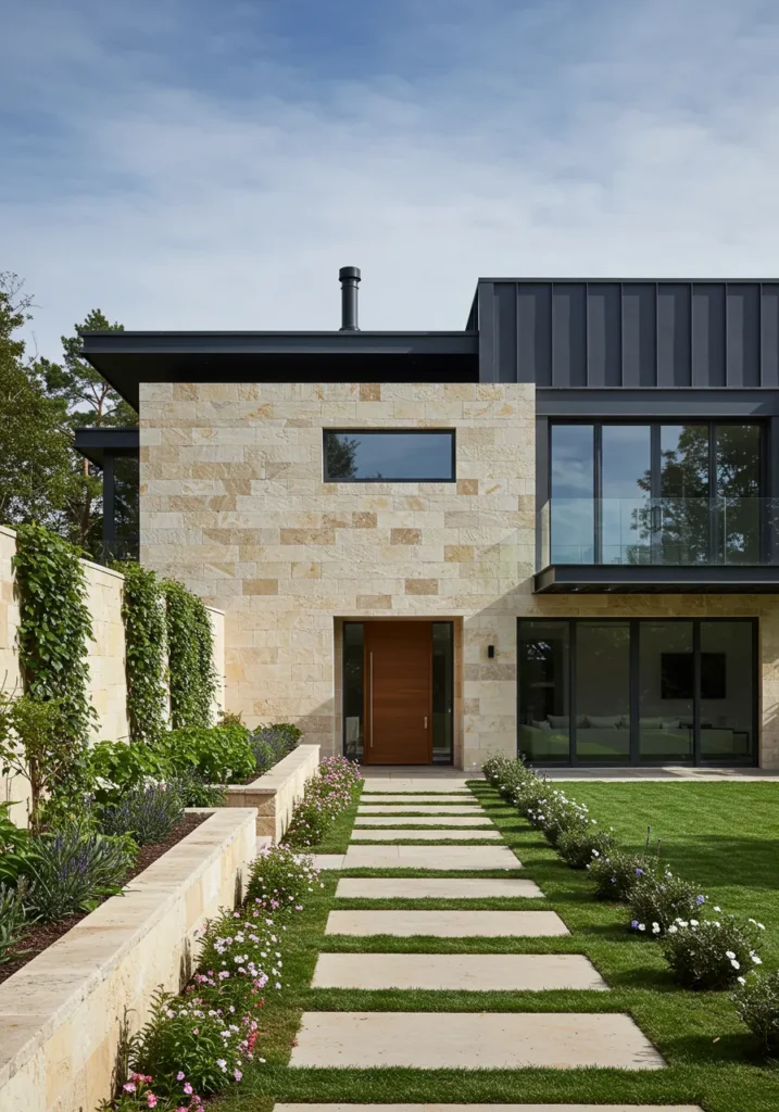 This stunning home perfectly blends modern luxury with natural textures, featuring a mix of clean lines, sleek windows, and the rich warmth of natural stone. The stone facade is complemented by black accents and large glass panels, giving the house a fresh, contemporary look. A carefully designed, spacious front yard with lush greenery and beautifully manicured walkways sets the tone for this home’s modern yet welcoming feel. The stone’s earthy tones, combined with the dark metallic roof, create a harmonious and balanced exterior that’s timeless yet modern.
