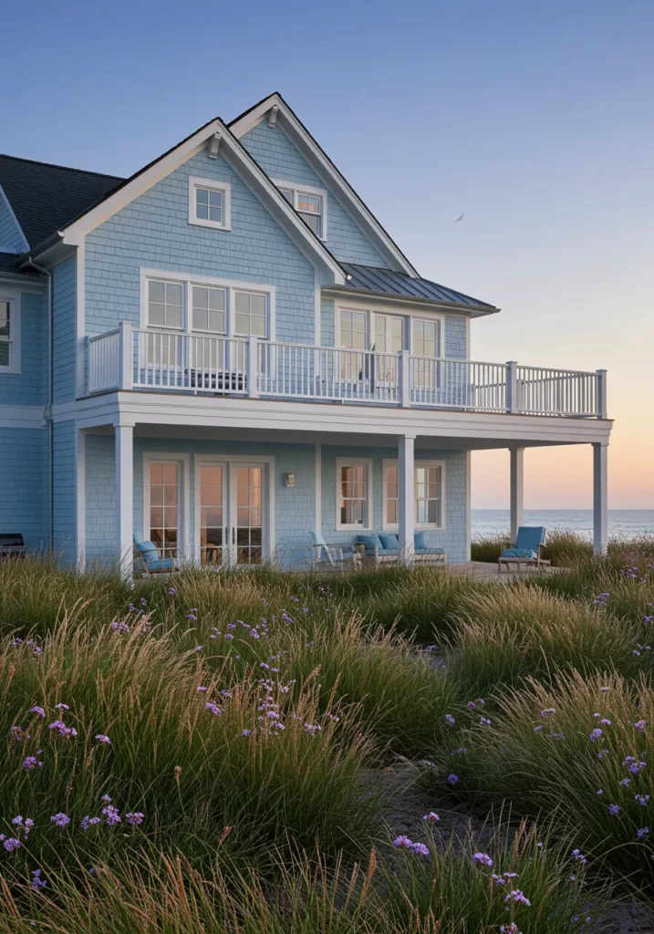 I’m absolutely in love with how calming and welcoming this design feels. The soft blue tones combined with the bright white trim really give the home a breezy, beachside charm that’s hard to resist. The spacious porch and the surrounding garden only add to the overall appeal, making it a place that feels both elegant and completely at home by the beach. I can totally picture myself spending lazy summer days in one of those comfy chairs, sipping iced tea while the waves crash in the distance. Pure bliss!