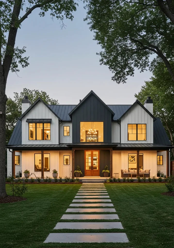 This charming farmhouse design features a striking contrast of dark and light colors, with black accents on the upper sections of the home and bright white walls on the lower levels. The combination of modern metal roofing and traditional wooden elements gives the house a sophisticated yet inviting feel. The front entrance is framed by tall, wide windows, allowing for plenty of natural light to flood the space. The meticulously manicured front yard is complemented by a clean stone pathway that leads to the front door, making it as welcoming as it is visually appealing.