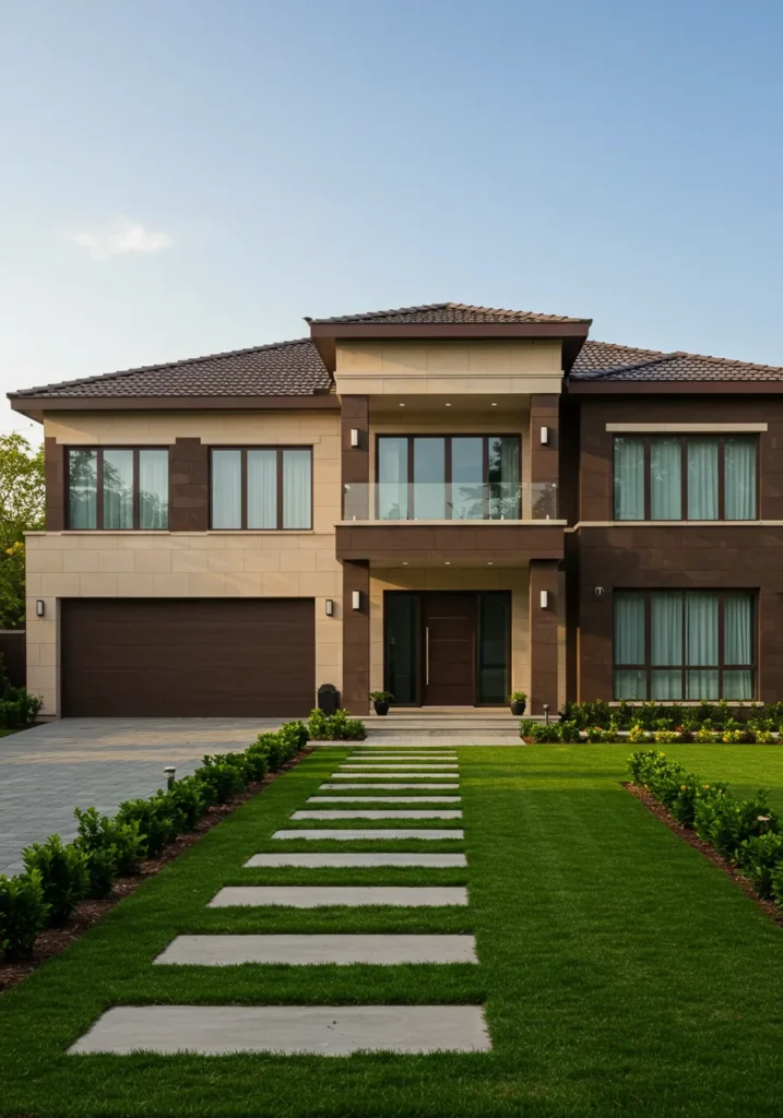 This contemporary home stands out with its stunning mix of light beige and deep chocolate hues. The smooth stone exterior panels paired with large windows create a clean and sleek facade, while the brown accents around the windows and doors add warmth and sophistication. The perfectly manicured lawn and straight, white stone pathway lead the way to the elegant front door, creating a striking entryway. The well-lit home is beautifully accentuated by strategically placed lighting, adding a touch of glamour at night.