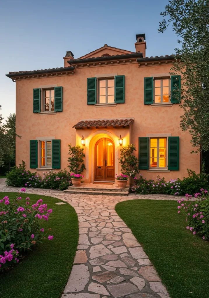 This Mediterranean-inspired home features a warm, stucco exterior that instantly evokes a sense of old-world charm. The soft peachy color of the facade is beautifully complemented by the green wooden shutters, adding a striking contrast to the sun-kissed walls. The arched doorway and tall, symmetrical windows give the house a classic, timeless appeal. The meandering stone pathway leading up to the door is framed by lush greenery and vibrant flowers, further enhancing the welcoming atmosphere of the home.