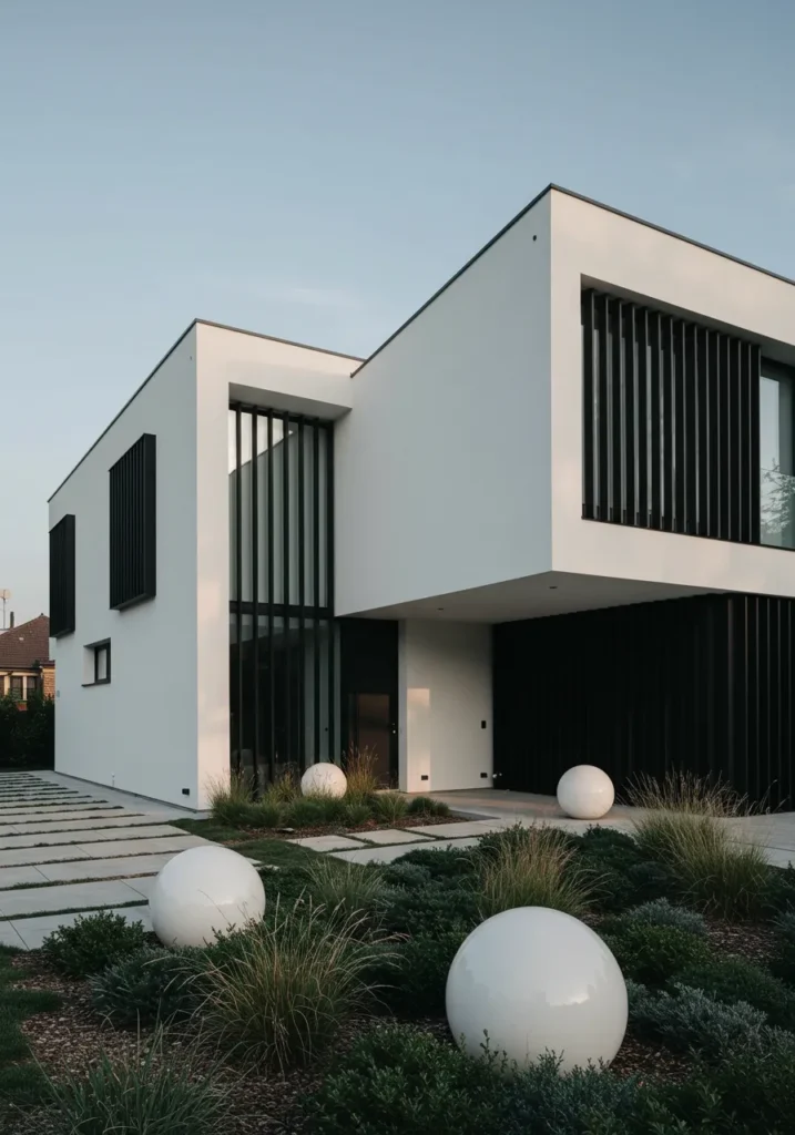 This stunning modern home boasts a sleek, minimalist design with crisp, clean lines and bold contrasts. The sharp, geometric structure is beautifully balanced by the interplay of black and white tones, while large glass windows let in natural light, creating a bright and airy interior. Vertical black slats on the exterior add texture and dimension, contributing to the sophisticated look. The thoughtful landscaping, featuring neat rows of greenery and oversized white spherical sculptures, complements the modern aesthetic, making the space feel both welcoming and stylish.