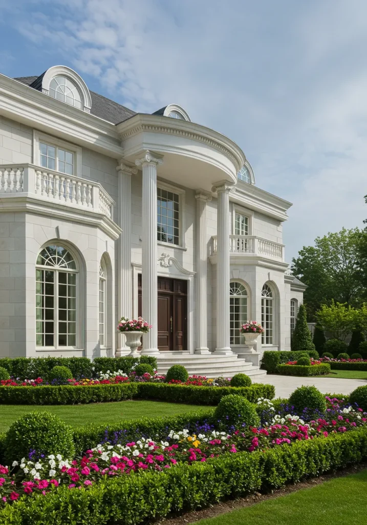 This beautiful mansion epitomizes elegance with its grand entrance, towering columns, and pristine stone facade. The large windows provide a sophisticated touch, while the stunning circular portico adds a layer of architectural beauty. The house is surrounded by meticulously landscaped gardens featuring lush greenery and vibrant flower beds, providing a welcoming atmosphere. The classical symmetry and stately design make it an extraordinary sight, radiating timeless luxury.