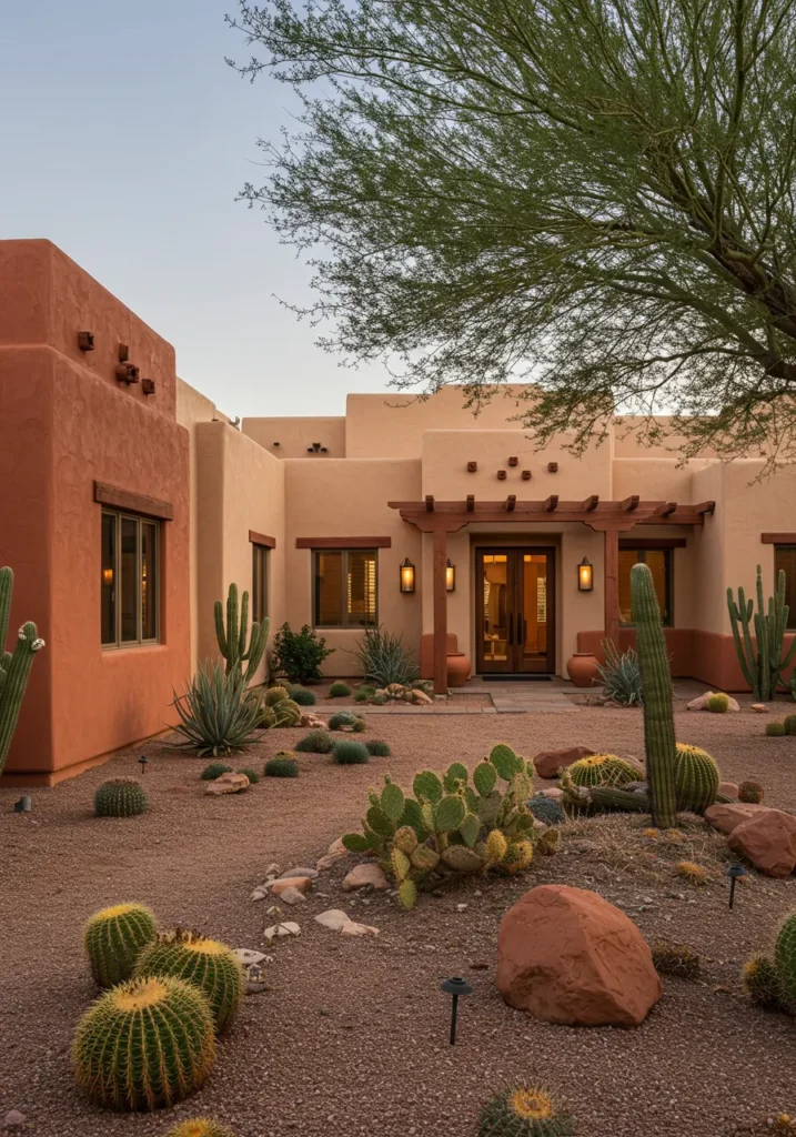 This charming home exudes a warm, Southwestern vibe, with earthy tones and rustic features that blend seamlessly with its desert surroundings. The stucco exterior is a soft terracotta color, paired with wooden accents around the windows and doors. A beautiful pergola frames the entrance, while desert plants like cacti and agave create an effortlessly chic landscaping design. The natural stone pathway leads to the door, guiding you through the arid yet inviting atmosphere of the home.