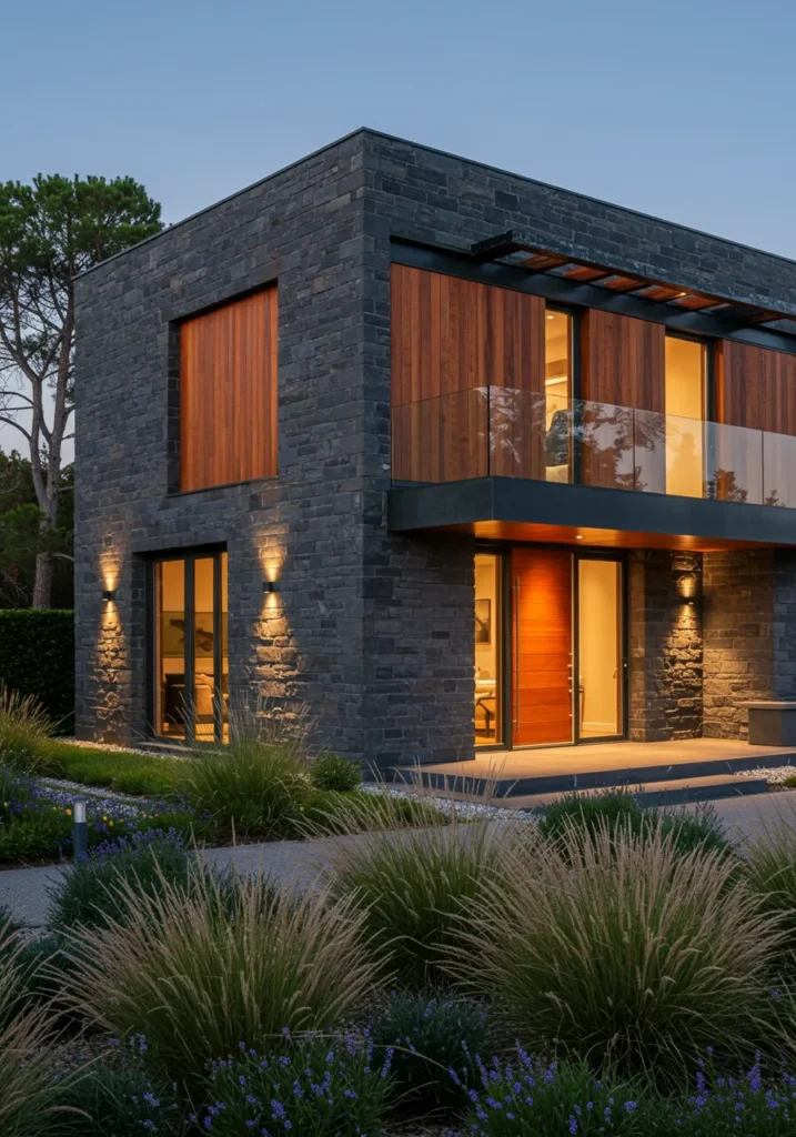 This modern home design features a striking contrast between dark stone and rich wood panels. The building’s sleek lines and minimalistic structure are enhanced by the glass balcony that creates a visual openness. The carefully chosen landscaping with soft grass and plants adds a subtle touch of nature, complementing the architectural elements. At night, the well-lit facade showcases the home’s bold features, making it stand out with elegance.